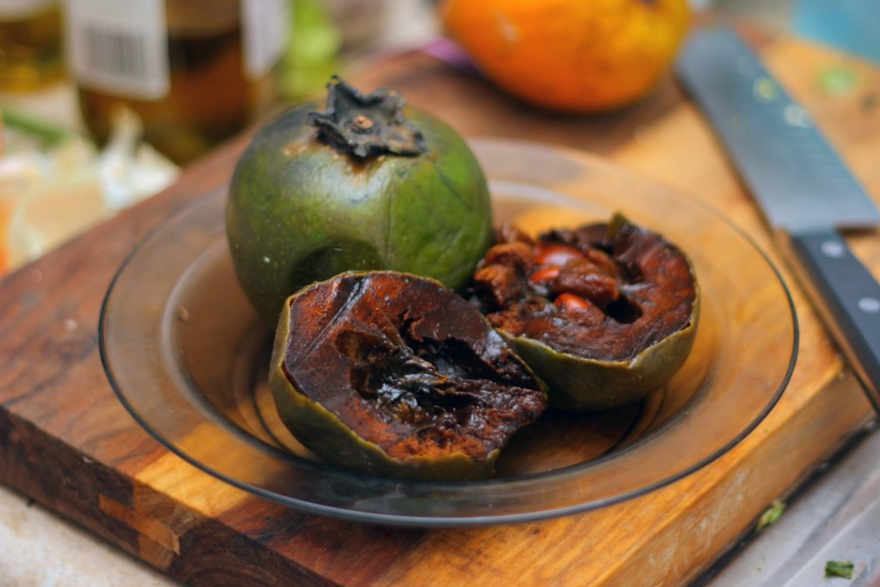 真正的“巧克力柿”另有其柿,正式名叫黑肉柿,原产于墨西哥一带。但它的外皮不是橙色,而是绿色,看着像没熟,切开后果肉呈棕黑色。它不是脆柿子,吃着口感绵滑。